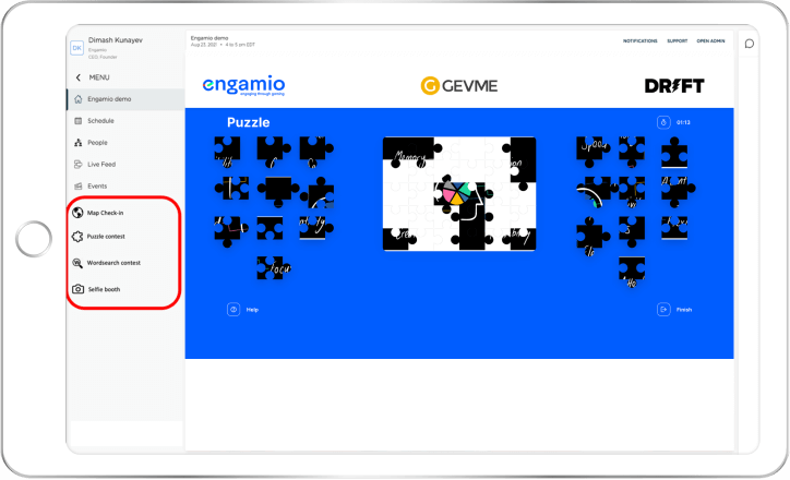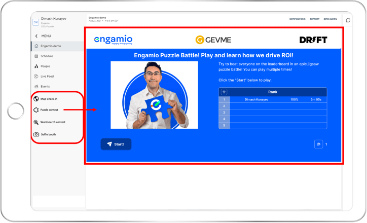 Let the puzzle battle engage your audience during the breaks or before the event! With Engamio you have an opportunity to take any image you want, turn it into a jigsaw puzzle, and supplement it with branding, storytelling and special offers.