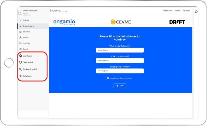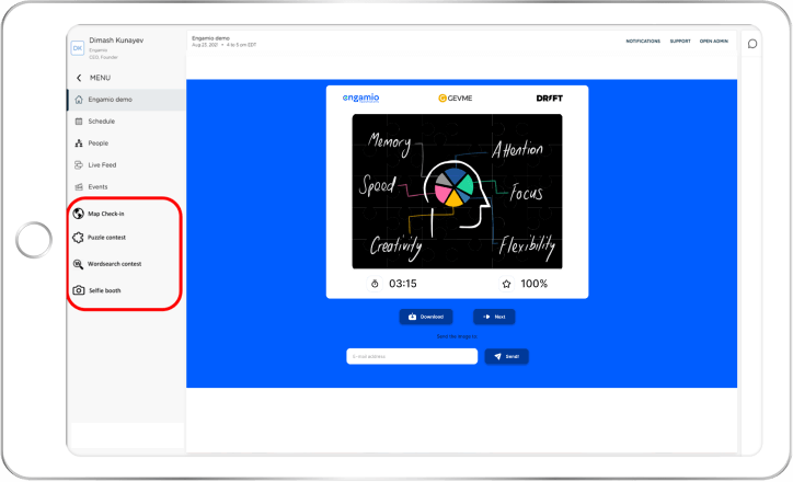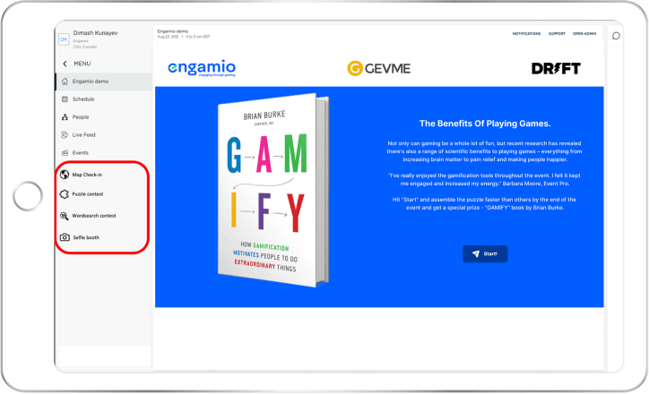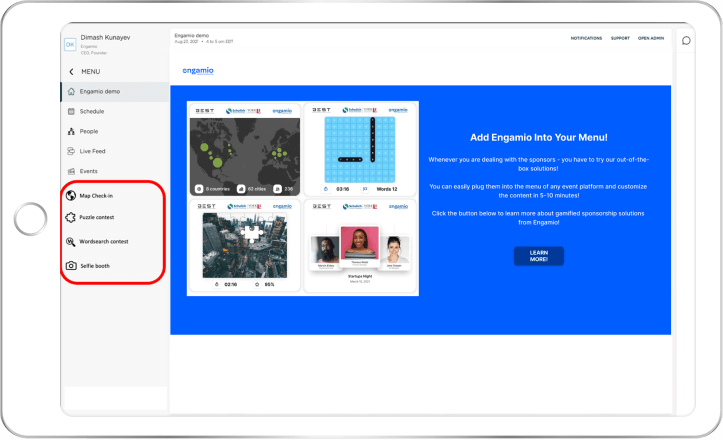 Engamio is an easy-to-use gamification add-on for your virtual and hybrid events. Design cool engaging experiences while driving ROI for sponsors & exhibitors!